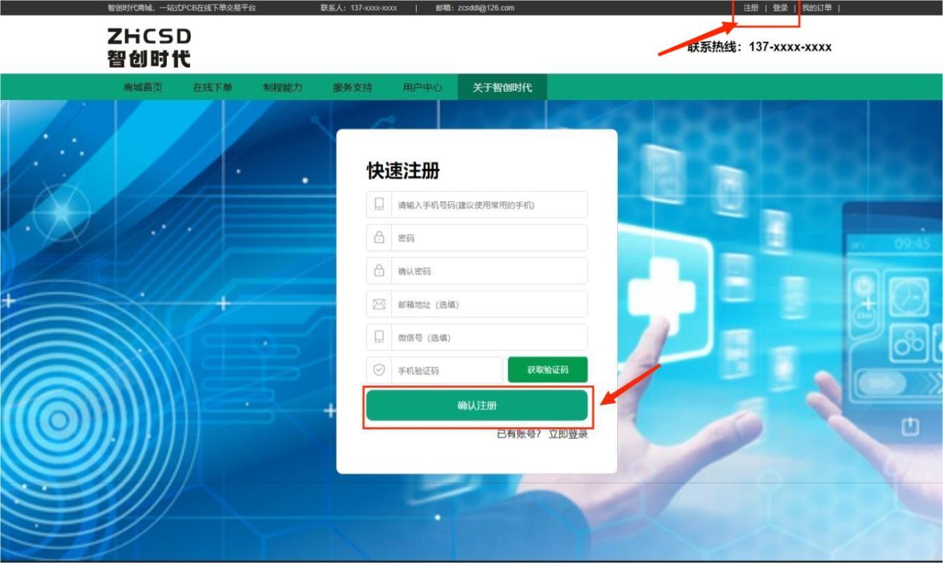 打开商城首页http://www.zcsdpcb.com/ 找到商城注册入口